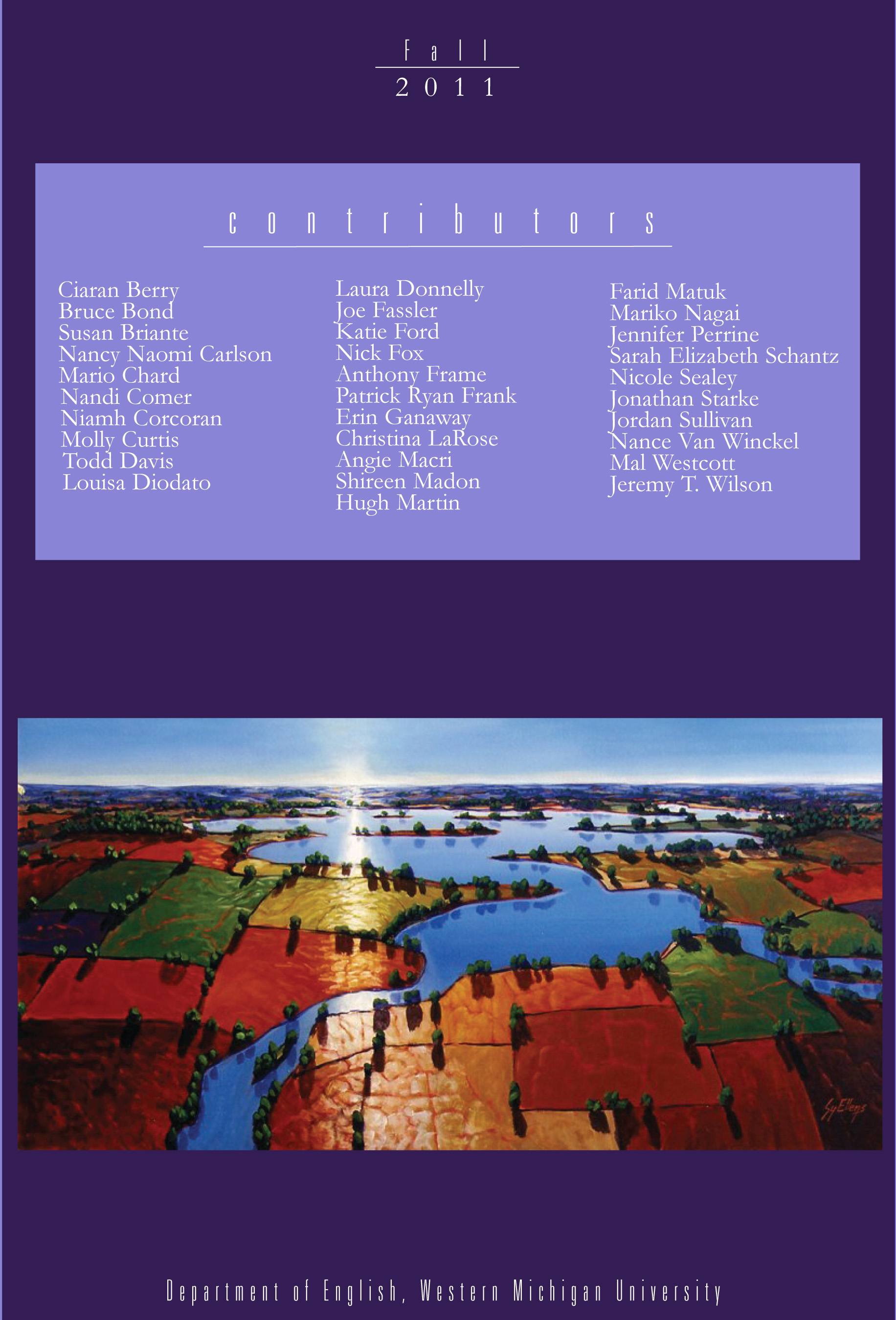 Fall 2011 Cover Art: Sy Ellens Front: Two Paths, 19" x 13", Acrylic on Watercolor Paper Back: Penetrating Sun, 24" x 48", Acrylic on Canvas FICTION Jordan Sullivan — Wuss Hugh Martin — Sunday Morning after Patrol in the Combat Housing Unit Nick Fox — The Exile Sarah Elizabeth Schantz — The Sound of Crying Sheep Jeremy T. Wilson — Trash Days POETRY Bruce Bond — Water Scripture Jennifer Perrine — On Fallibility Nancy Naomi Carlson — The Smoke that Bore Us (Translation of Rene Char's "Cette Fumee Qui Nous Portait") Ciaran Berry — Burned Things Louisa Diodato — Cockleshells Mario Chard — Prosthetic Patrick Ryan Frank — A Runner Stumbles Nandi Comer — Chicken Niamh Corcoran — Acyanoblepsia (the non-perception of blue) Shireen Madon — From a Terrarium Farid Matuk — Say Providence ×€ Letter from a Birmingham Jail Erin Ganaway — Meds Susan Briante — May 14 The Dow Closes Down 10620 Nance Van Winckel — Unable to Sort the Sad from the Snaggle-Toothed Molly Curtis — Elegy Angie Macri — Hephaestus's Fire ×€ Thebes Courthouse Nicole Sealey — Unframed Laura Donnelly — Driving Home to Sirens Anthony Frame — Prayers Mal Westcott — Interpreting Crop Circles Todd Davis — Hermetic Katie Ford — We Do Not Know What We Know CREATIVE NONFICTION Mariko Nagai — Excerpt from Imaginary Death Christina LaRose — What Prison Is to the Body DRAMA Jonathan Starke — Stitches INTERVIEW Joe Fassler — Interview with Donald Ray Pollock